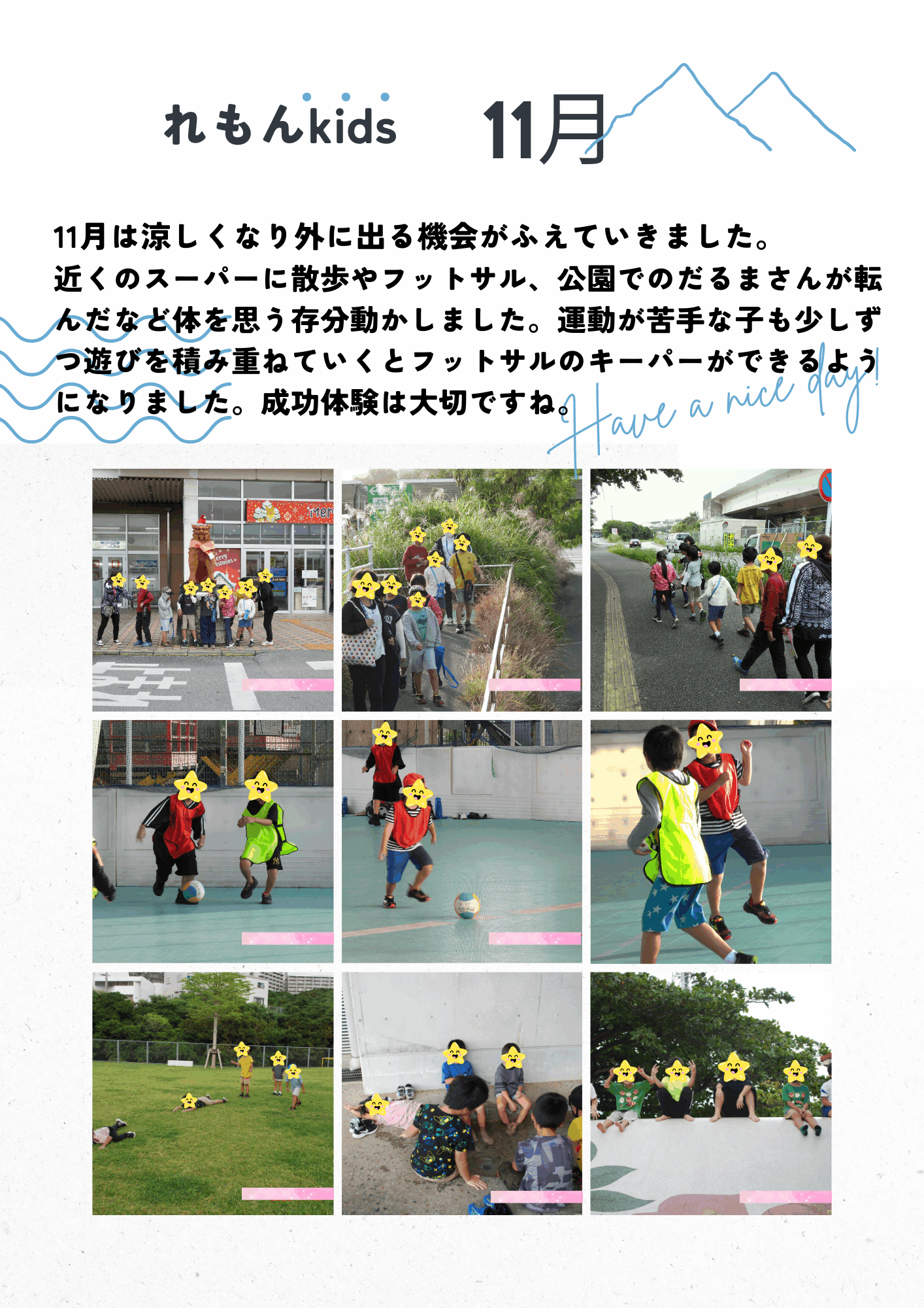 近くのスーパーに散歩やフットサル⚽、公園でのだるまさんが転んだなど体を思う存分動かしました。運動が苦手な子も少しずつ遊びを積み重ねていくとフットサルのキーパーができるようになりました。成功体験は大切ですね😊